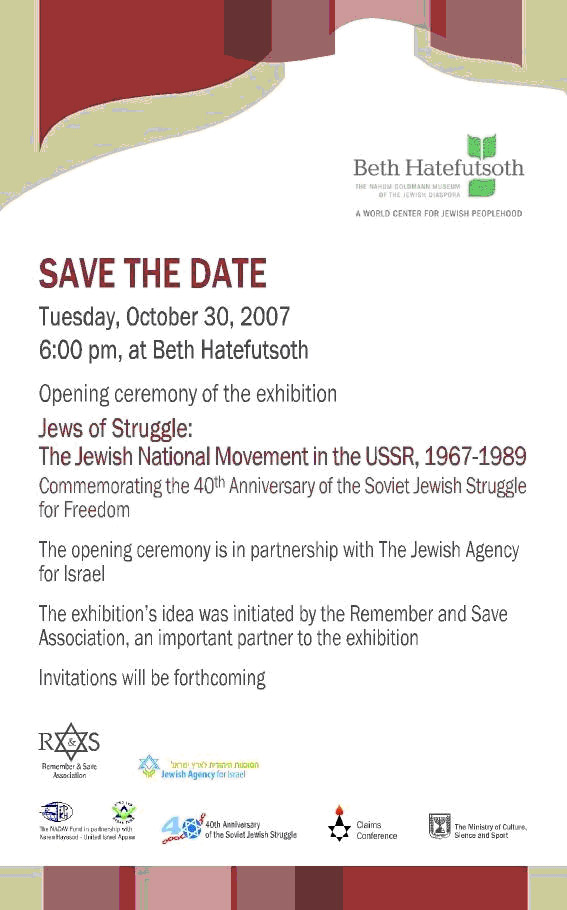 По этой причине мы отмечаем в 2007 году сорок лет с начала движения советских евреев за репатриацию в Израиль, сорок лет с того момента, когда «евреи молчания» стали «евреями борьбы». Одним из многочисленных мероприятий, посвященных этой годовщине, является выставка, которая откроется 30 октября 2007 года в Музее Диаспоры (Бейт hа-Тфуцот) в Тель-Авиве. Идея и концепция выставки были инициированы Ассоциацией «Запомним и сохраним», выставка разработана и создана Музеем Диаспоры с участием Ассоциации «Запомним и сохраним», предоставившей Музею для выставки значительную часть экспонатов.