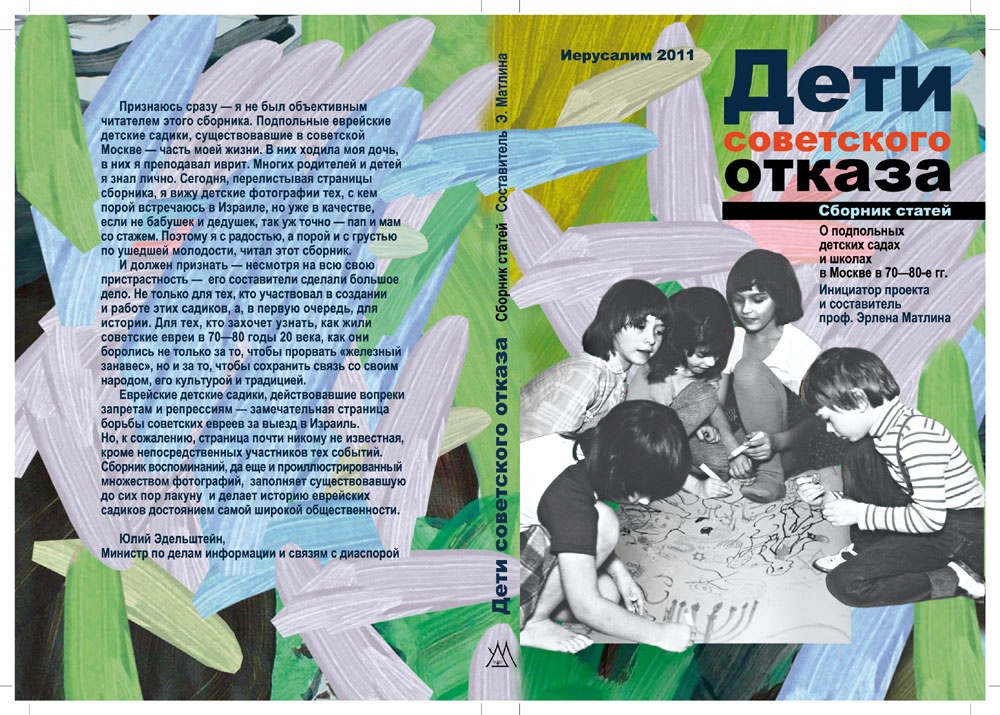Издательством "Маханаим", Иерусалим, в этом году выпущена в свет книга под названием "Дети советского отказа" - сборник статей о подпольных детских садах и яслях для еврейских детей в Москве 1970-80-х годов. Инициатором этого проекта и составителем сборника является профессор Эрлена Матлина, репатриировавшаяся в Израиль в 1987 году и работавшая в Центре еврейского образования "Маханаим" в Иерусалиме. Проживает в Маале-Адумим. Вниманию посетителей сайта предлагается аннотация к сборнику, а также фотографии обеих страниц обложки и титульного листа.