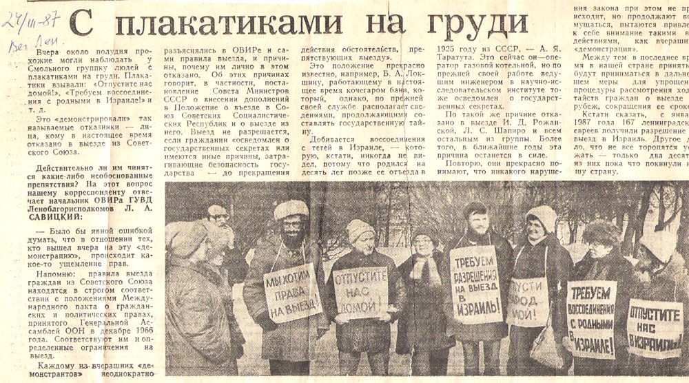 Since I was now officially making plans to go to the US, my poster had been inscribed with ''We want the right to leave'' instead of ''Let me go to Israel.'' In this regard, within ''Nativ'', the Israeli governmental agency engaged in providing international support for the aliyah movement, there arose numerous problems concerning the dissemination of information about the demonstration. One of the participants had come with an ideologically unacceptable placard. ''Nativ'' printed a message about it in a leaflet by Nan Greefer just four months later when I was already in Israel. The writing on my poster was intentionally blurred, and my name was not mentioned in the leaflet. The authorities in Leningrad acted much more expeditiously. On the day following the demonstration, March 24, 1987, an item appeared on the last page of the newspaper "Vecherny Leningrad" (''The Evening Leningrad.") The headline read ''With Placards on Their Chests'' and told of our demonstration. There was also a photo. (While taking this photo they moved all the policemen out of the camera's field of vision). To the best of my knowledge it was the first photograph of refuseniks in the Soviet press. The article listed all the demonstrators except me and said that the refusals issued to the protestors had been proper. My older sister Tema worked at the Radio Equipment Research Institute, a "closed", or secret government enterprise. When she came to work, she noticed the all her colleagues' heads were bent over the latest edition of the newspaper and they were discussing something. "Tema, look, this looks a lot like your brother. If I didn't know that it was impossible for him to be in their midst, I would have to say it was him for sure." It took my sister's breath away. What if her brother's name was mentioned in the news story? They would fire her. She ran to the party committee room, found the latest edition of "The Evening Leningrad" and carefully scanned the text of the article. She sighed with relief. I did not attribute any particular importance to the fact that my name was not mentioned, but seasoned refuseniks interpreted it as a good sign. And that's how it turned out. Three days later I got a call from the Visa Office. ''You have been granted permission to leave! Stop by OVIR for your documents.'' I wondered if the state’s interests had already changed. I scarcely had time to catch my breath. On arrival at the OVIR office, they took me to an inner room, where a female police major announced that, yes, they would give me an exit permit, but not for emigration to my wife in the US, but to Israel, as I had applied for previously. This decision was completely illegal. (That's the way they got their revenge with this latest meanness.) It meant that they would take away my Soviet citizenship and I would have to pay for it. [All Jews, (and only Jews) leaving the USSR with an invitation from Israel were stripped of their Soviet citizenship and had to pay what amounted to the enormous sum of 500 rubles per person, including children. This was 6-7 times more than the average engineer's monthly pay. - Translator.] In addition to that, I could only buy an airline ticket to Vienna, and not to the US. Because of that I would be left almost penniless in Vienna and without a plane ticket to my beloved wife. [ One was permitted to exchange only 90 rubles into dollars per person. We could only pay in rubles for expensive Aeroflot Airline tickets. According to the official rate of exchange at that time, this amounted to only about $141. That was the exchange rate for the ordinary human beings. There were calculations for international trade that were based on a different, "realistic" rate of exchange. - Translator.] The policewoman conveyed her good news while distancing herself toward the opposite end of the large room so there would be time to react in case I threw myself at her. By now I had crossed the line and was considered a demonstrator and a brawler - a danger to others. But upon reflection, I made the decision that the documents for emigration to Israel, where I had intended to go anyway, would permit me to take substantial luggage, and so I did not protest their conditions. For the paperwork, I had to stop by the personnel department at my place of work - VPTI. Even if I did not have to do so, I would go anyway, just to see the reaction by the staff. Dina Sergeevna greeted me warmly, even genially. She told me how one of the employees had married a Norwegian woman who now visited people, dropped by work, even, it seems, brought certain kinds of gifts. It sounded like the request by a petty Soviet worker's cronies in Galich's song about the aunt in Fingalia. They ask him to send them "something that won't be needed over there." [In one of his songs/poem, "The Ballad of Surplus Value", the Jewish bard Alexander Galich sings of a petty-hero, homo-Soveticus, a proletarian who is left a fortune by his auntie in the fictional country of "Fingalia". He pays for a raucous farewell binge with his cronies who ask him to send them something. They say, "When you get there, send us something you don't need." But when he already has a plane ticket to Fingalia, he hears a Soviet radio broadcast solemnly congratulating Fingalia for a socialist revolution with "all power to the people" and that all factories have been nationalized. In Galich's song we hear the would-be millionaire's spluttering curses at the untimely operation of "Karl Marx's party tricks." - Translator.] About 20-25 people worked in my sub department and about a third of them were Jews. There was the cowardly Roma from Zhmerinka who was granted an exit visa, but reconsidered. I brought my colleagues a big cake to regale them with a treat in honor of my departure. I cut the cake and observed who ate it and who didn't. At least half of the staff took a piece. Of the others, some didn't even touch it for fear that they would be denounced. Our sub department head, 