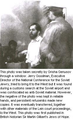 At that moment, through the window I saw the Jews outside the court building start to run. Some men in plain clothes were chasing them. It turned out that Grigory Genusov took a picture of me through the courtroom door, and they tried to grab him with his camera. He was fast enough to hand the camera to other refuseniks and they fled.