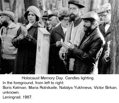 In the western part of our country every big city and small town has a place where Jews were killed. On anniversaries of mass executions people used to assemble there to pay homage to those who were killed. In some places these were meetings with more or less considerable participation, in others only a few mourners used to come. In Leningrad such a place and date do not exist (the tragic events in Pushkin/Tsarskoye Selo were not known then). The International Holocaust Memorial Day – Yom ha-Shoa in Hebrew- is timed to the anniversary of the beginning of the Warsaw Ghetto Uprising which took place in April-May 1943; this is a shifting date because it is set according to the Jewish (lunar) calendar. This is the day that Leningraders started to observe.