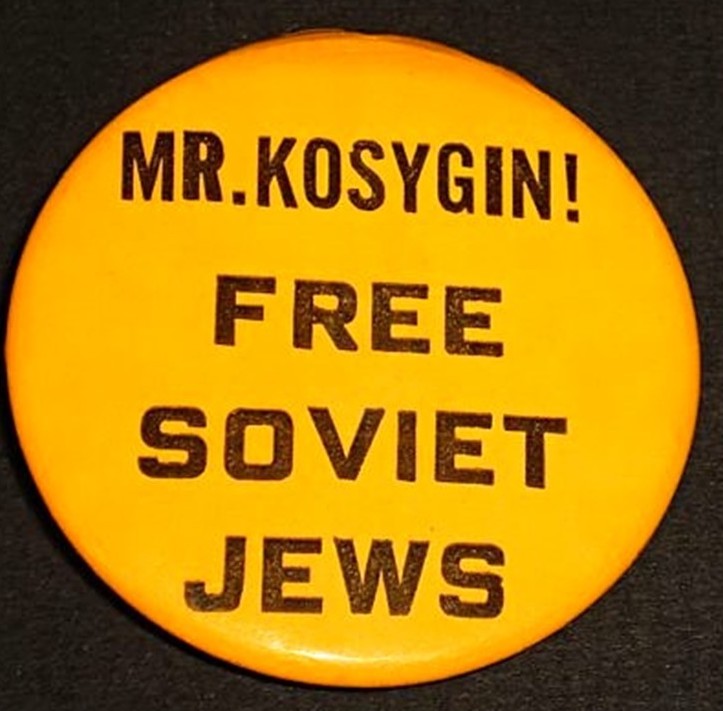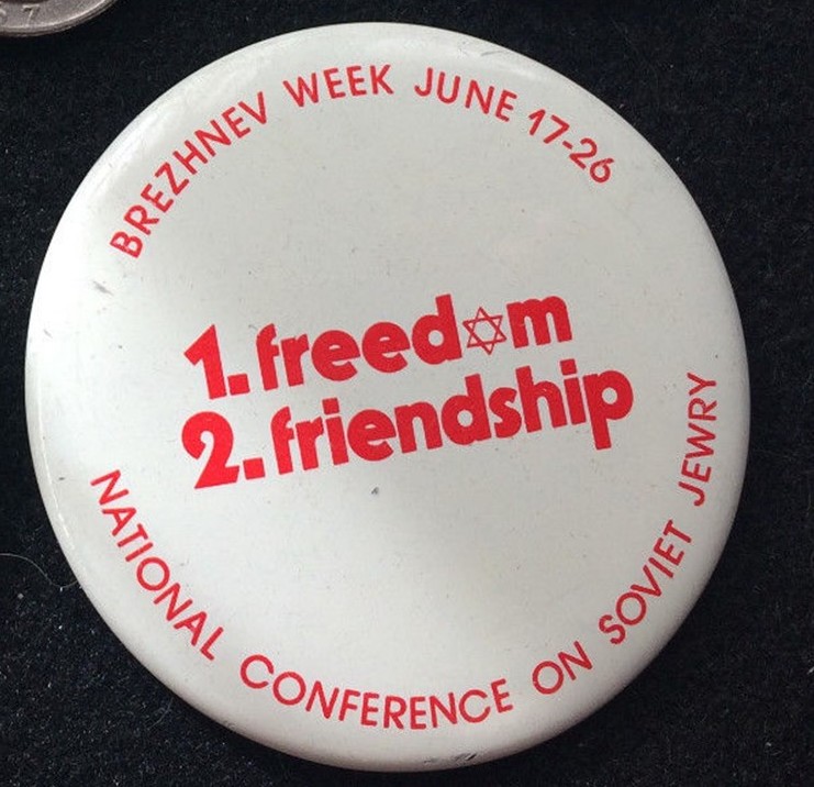 В начале 70-годов прошлого века состоялось три встречи между президентом США Ричардом Никсоном и Генеральным секретарем ЦК КПСС Леонидом Брежневым. Автору известен значок, выпущенный еврейскими правозащитниками в США к саммиту 1973 года (рис. 2). Значок, относящийся к саммиту, проходившему в Вашингтоне в июне 1973 года выпущен организацией National Conference on Soviet Jewry (NCSJ). Эта организация была создана в 1971 году с целью зашиты прав советского еврейства и играла важную роль в борьбе за эти цели в последние два десятилетия холодной войны.