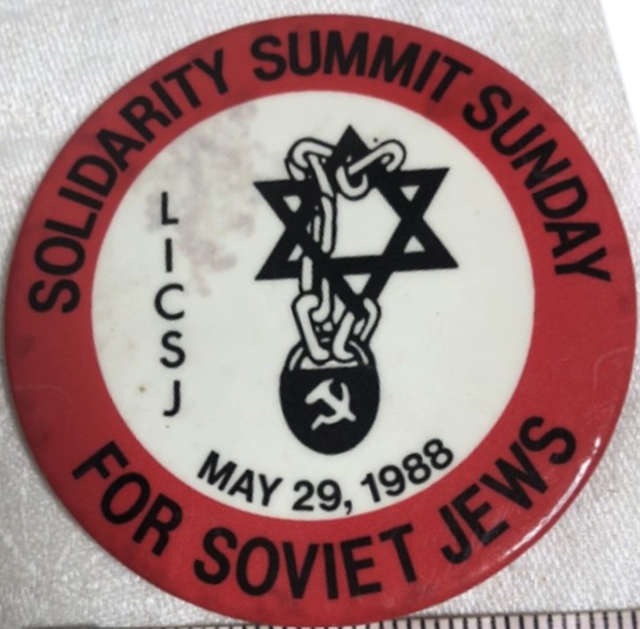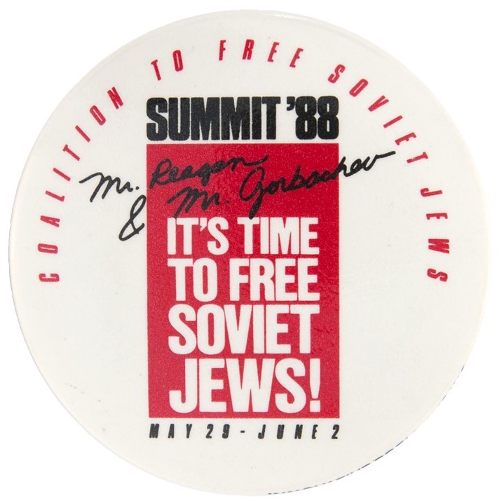 В конце весны 1988 года в Москве состоялась последняя встреча президента Рональда Рейгана с Михаилом Горбачевым. Перед отъездом американской делегации на саммит руководители еврейских организаций передали государственному секретарю Джорджу Шульцу памятную записку, в которой требовали свободной эмиграции для всех евреев, которые хотели уехать и полные культурные, религиозные и образовательные права для тех, кто останется. Еврейские лидеры также встретились с секретарем Шульцем 3 мая 1988 г. В Москве президент Рейган встречался с группой отказников. Саммит в мае-июне 1988 г. в Москве привел к увеличению количества выездных виз и либерализации культурной и религиозной жизни советских евреев. Саммиту 1988 года посвящены значки, изображённые на рисунках 9 - 12, выпущенные NCSJ, Комитетом Лонг Айленда за советских евреев (Long Island Committee for Soviet Jewry (LICSJ)) и студенческой организацией The Student Coalition for Soviet Jewry (SCSJ), которая была организована после ареста Анатолия Щаранского в марте 1977 года.