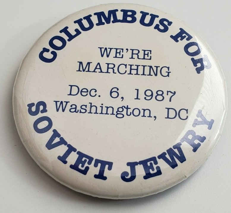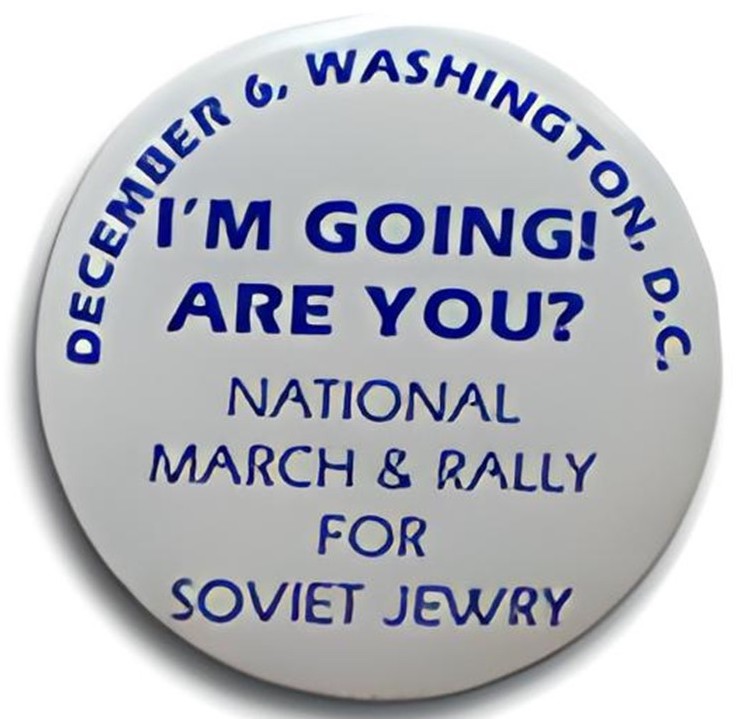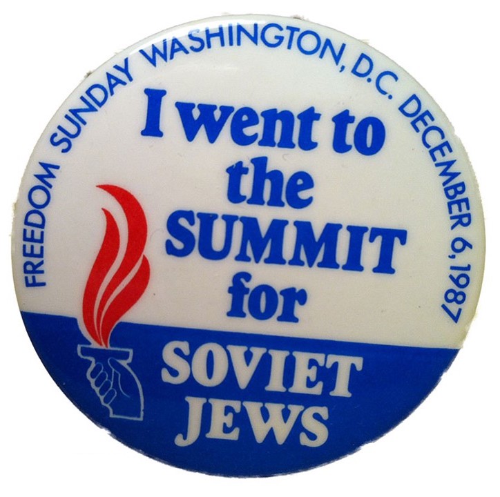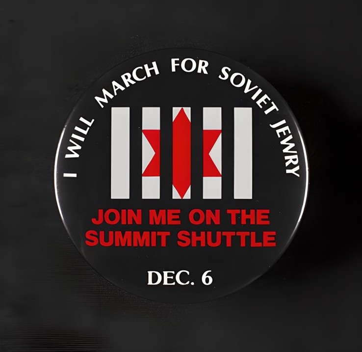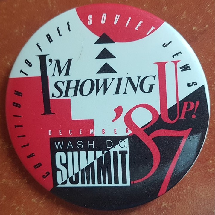С восьмого по десятое декабря 1987 года в Вашингтоне проходила встреча президента Рональда Рейгана и Генерального секретаря ЦК КПСС Михаила Горбачева. Перед проведением саммита Конференция за советское еврейство (NCSJ) создала коалицию, включающую 9 общественных организаций, для мобилизации общественности на демонстрацию в поддержку права советских евреев на иммиграцию. В США и Канаде был проведен ряд митингов и других мероприятий. Дэвид Харрис, представитель Американского Еврейского Комитета в Вашингтоне, был выбран национальным координатором массовой демонстрации. (Американский Еврейский Комитет (AJC) - еврейская организация в США, задачей которой является защита прав и интересов евреев в США и других странах. Основан выходцами из Германии в 1906 году, после очередной волны погромов в России). Демонстрация была проведена 6 декабря. На демонстрации в присутствии 250000 человек выступили представители еврейских организаций, общественные деятели и политики, среди которых были вице-президент Джордж Буш, спикер палаты представителей, епископ Уильям Келлер от Национальной конференции католических епископов, доктор Ари Брауэр из Национального совета церквей, Эли Визель лауреат Нобелевской премии мира 1986 года и несколько советских еврейских активистов. Автору известно 5 значков посвященных этому событию (рис. 3–7). На фотографии (рис. 8) изображены Натан Шаранский и Владимир Слепак на демонстрации 6 декабря. На пальто Слепака слева значок, изображенный на рисунке 5.
