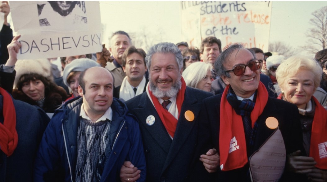 Рис. 8 Бывшие отказники Натан Щаранский (слева) и Владимир Слепак вместе с Эли Визелем и американским еврейским лидером Шошаной Кардин (справа) на марше в Вашингтоне, округ Колумбия, в поддержку советского еврейства, 6 декабря 1987 года. (Peter Turnley/Corbis/VCG via Getty Images) Фотография из [9].