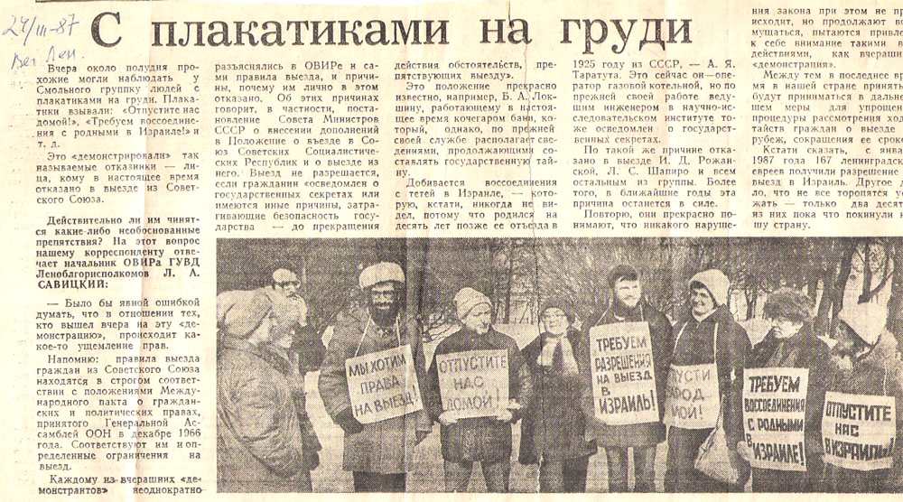 Из-за того, что я официально собирался теперь в США, на моем плакате было написано: "Мы хотим права на выезд", а не "Отпустите меня в Израиль". В связи с этим у "Натива", израильской правительственной организации, занимавшейся обеспечением международной поддержкой активистов алии, возникли большие проблемы с распространением информации о демонстрации, на которую один из участников вышел с идейно неправильным плакатом. Они напечатали сообщение о ней в Лондоне, в листовке Нэн Грифер, только четыре месяца спустя, когда я уже был в Израиле. Надпись на моем плакате была искусственно смазана, а моё имя в листовке не упомянули. Гораздо проворнее поступили власти в Ленинграде. На следующий день, 24 марта 1987 года, на последней странице "Вечернего Ленинграда" появилась заметка "С плакатиками на груди", где рассказывалось о нашей демонстрации. Была и фотография (милиционеров для её съемки вывели из кадра), первая, насколько мне известно, фотография отказников в советской прессе. В статье перечислялись все демонстранты, кроме меня, и утверждалось, что отказ протестантам был выдан правильно. Моя старшая сестра Тэма работала тогда на закрытом предприятии, в НИИ радиоаппаратуры. Придя на работу, она увидела, что сотрудники что-то обсуждают, склонившись над свежей газетой. "Тэма, смотри, этот парень удивительно похож на твоего брата. Если бы я не знала, что его среди них не может быть, я бы сказала – точно он". У сестры перехватило дыхание; а что, если в заметке указаны фамилия брата? Её же тогда уволят. Она побежала в партком, нашла последний выпуск "Вечерки" и внимательно пробежала текст статьи. Вздохнула с облегчением. Этот факт неупоминания, которому я лично не придал значения, был истолкован бывалыми отказниками, как хороший знак. Так и оказалось. Через три дня мне позвонили из ОВИРа. "Вам дано разрешение на выезд! Зайдите в ОВИР за документами". "Что, интересы государства уже изменились?" – только и успел выдохнуть я. По приходе в ОВИР меня отвели во внутреннее помещение, и там женщина-майор милиции объявила, что, да, разрешение на выезд они мне дают, но не на выезд в США к жене, по моему последнему заявлению, а в Израиль, как я ходатайствовал раннее. Это решение, будучи совершенно незаконным (так они мне мстили последней своей подлостью), означало, что у меня отнимут советское гражданство, и что мне за это придётся заплатить, а также то, что авиабилет я смогу купить только до Вены, а не до США. Так как валюту вывозить практически не разрешалось (меняли по 141 доллару а человека), они оставляли меня в Вене без денег и без билета к любимой супруге. Свою благую весть милиционерша сообщила, отойдя в противоположный конец большой комнаты, чтобы было время среагировать, если я на нее брошусь. Я ведь теперь проходил у них, как демонстрант и скандалист, опасный для окружающих. Но я, поразмыслив, решил, что документы на выезд в Израиль, куда я всё равно направляюсь, позволят мне взять с собой значительный багаж, и не стал протестовать. Для оформления документов мне потребовалось зайти на работу в отдел кадров своего ВПТИ. Даже если бы и не надо было, я бы и так пошёл, хотелось посмотреть на реакцию сотрудников. Дина Сергеевна встретила меня очень тепло, прямо сердечно. Она рассказала, как кто-то из сотрудников женился на норвежке и теперь приезжает в гости, заходит на работу и, 