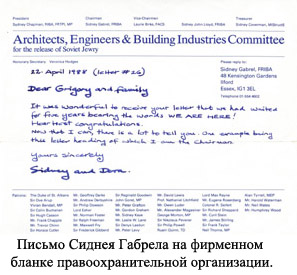 И только приехав в Израиль и получив письмо на фирменном бланке, я понял, что Сидней возглавлял британский Комитет архитекторов и инженеров за освобождение советского еврейства (Architects, Engineers&Building Industries Committee for the release of Soviet Jewry). Комитет, созданный в 1973 году, ставил своей целью помогать законным путем коллегам в СССР осуществить свое право эмигрировать и получивших отказ. Комитет определял себя как не антисоветская и не просионистская организация.