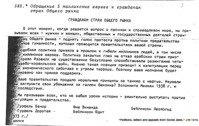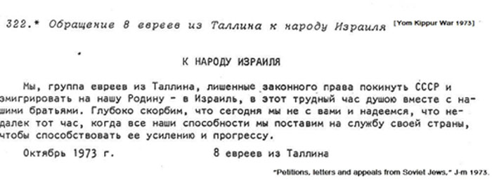 Действия К осени мы познакомились с двумя отказниками из Риги: Жаном Ройзманом и Валерием Каминским, и они пригласили Бенора приехать в конце ноября в Румбулу (место уничтожения евреев Риги), где еврейские активисты решили привести в порядок захоронения. Тут-то и произошло наше знакомство с Таллинским КГБ. В день отъезда в Ригу Бенор пришел с работы пораньше и готовился к отъезду, когда в дверь позвонили. Он открыл, не посмотрев предварительно в «глазок». Вошел человек в штатском, предъявил документы на имя капитана КГБ Исмикеева, сказал, что хочет побеседовать с Бенором, и предложил поехать с ним. Бенор успокоил побледневшую тещу (она не видела документы, но «гэбэшников» узнавала безошибочно: насмотрелась еще в 30-х), сказав, что скоро вернется. Исмикеев привез Бенора на Пагари 1 (здание Эстонского КГБ), провел в большой кабинет на третьем этаже и сказал, что они знают о нашей деятельности (оказалось, что довольно много). Настоятельно порекомендовал ему не ехать в Румбулу и отпустил. Было ясно, что в Румбулу Бенору поехать уже не удастся. Это было для нас хорошим уроком: следующие поездки мы уже не обсуждали по телефону. Раз уж речь пошла об участии в акциях на кладбищах, то надо отметить, что начиная с 1974 года, мы ежегодно приносили венок с надписями на иврите к памятнику на Таллинском Еврейском кладбище и выступали там (в 74-м Алик читал стихи, в 76-м Бенор выступил с речью). Талла ездила в 74-м и 76-м в Киев в Бабий Яр, где ежегодно 29 сентября «отказники» устраивали шествие с венками. Власти в Киеве старались всеми силами не допустить этого, задерживали предполагаемых участников и приехавших из других городов. Происходящее произвело неизгладимое впечатление. В 74-ом в Бабьем Яру был только памятный камень, поставленный властями в средине 60-х. Талла приехала прямо из аэропорта. Это был теплый солнечный выходной день. Возле камня было довольно много людей и еще больше милиционеров и сотрудников в штатском. Подойти непосредственно и положить туда цветы не разрешали, никаких речей тоже не было. Талла спросила у окружающих, чего все ждут, и в ответ услышала, что должны придти «отказники» и принести венки. Наконец, появилась достаточно большая группа людей с венками, сопровождаемые плотными рядами милиционеров. Как выяснилось, участники приехали с разных сторон на метро и вышли на ближайшей к Яру остановке, где и были встречены милиционерами. Венки привезли на машине туда же, но когда начали прикреплять ленты к венкам, милиция немедленно отобрала ленты, но после долгих переговоров все же разрешила участникам пойти к Яру. Аня Злобинская, мать которой была убита в Бабьем Яру, пыталась сказать что-то, но это ей не удалось. В 76-ом установили помпезный памятник достаточно далеко от реального места, и власти готовили открытие 29 сентября. Отказники из разных городов тоже решили поехать. Киевские отказники даже сумели получить официальное разрешение на возложение венков к подножью нового памятника. К этому времени наши передвижения по стране стали весьма ограниченными, но Киев для Таллы еще был досягаем, т.к. там жила ее тетя, которая была уже тяжело больна (в апреле 1977-го во время поездки на научную конференцию во Львов Талла получила предупреждение от соответствующих органов, что ее снимут с самолета, если она полетит через Москву или Киев). Непрекращающ