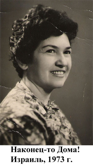 Сегодня, в свои 73 года, я пишу эти строки и думаю: «Господи! Да неужели я всё это пережила? Неужели я через всё это прошла, всё это делала? И какое же счастье, что я Дома! Какое же счастье, что он есть, наш Дом! Как же мы должны беречь его, хранить его навеки! И в память о близких, не доживших до дней исполнения мечты своей - жить и умереть в стране наших предков, в Израиле, в память о дедушке, об отце моём - молитва моя Богу: