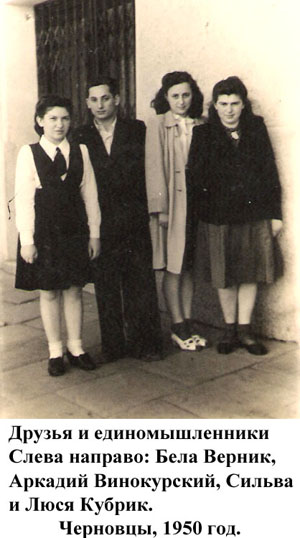 После замужества моей старшей сестры в 1945 году мы переехали в город Черновцы. В 1949 году я закончила седьмой класс в женской школе №6. Дальнейшее обучение продолжала в вечерней школе рабочей молодёжи, совмещая учёбу с работой. С августа 1949 года и почти до её закрытия в 1950 году я работала секретарём в единственной еврейской школе города.