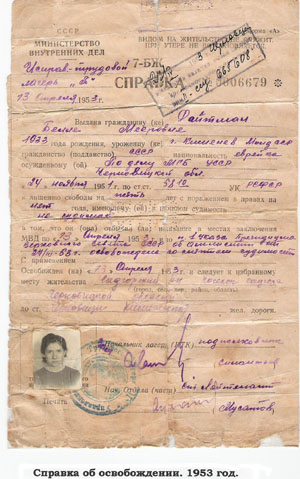 После освобождения была отправлена на постоянное место жительства в Садгору - районный центр, недалеко от Черновиц. Помогла сестра. За взятку прописали в Черновцах. На работу никуда не брали, даже швеёй.