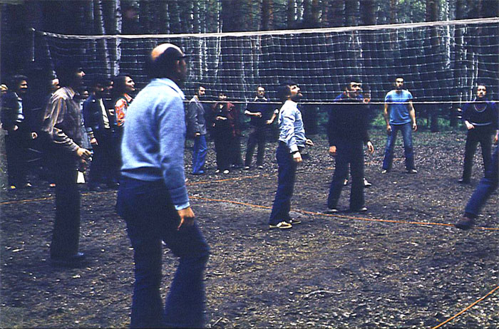 Волейбол – любимая игра. У сетки стоит Юлий Кошаровский – нападающий. За ним – защитник – парень из Израиля (в голубом свитере, на переднем плане спиной к фотоаппарату). Он молчал в целях конспирации целый день. Иностранцам нельзя было выезжать за пределы Москвы дальше 30-го км. Парень с интересом наблюдал за всем происходящим, играл в волейбол… молча. |