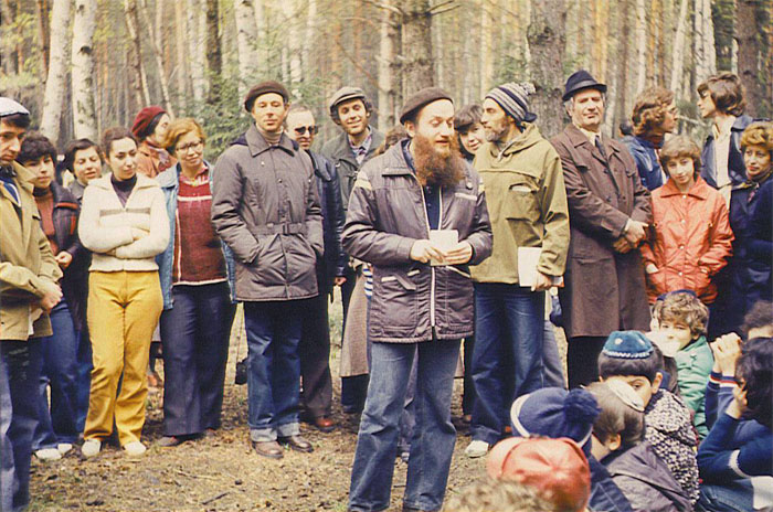 Эссас задает вопросы по Торе. Дети призадумались. Родители слушают, «болеют» за своих чад. В центре фото Элиягу Эссас. Справа от него в вязаной шапочке Арон Гуревич, слева за Эссасом (в кепке) улыбающийся Борис Чернобыльский (покойный). |