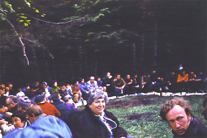Вы видите, что слушатели сидят на бревнах и перед ними белая полоса – это играющие роль скатерти листы компьютерных распечаток. В песне об «Овражках» поётся: «Мы раскатаем на траве «столы»/ Лехаим скажем,/ Улыбнемся взглядом.» - это те самые «столы» из распечаток.