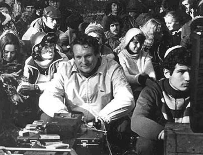 1-й фестиваль еврейской песни, 1977 г., Суккот. На переднем плане: ответственные за звуковое оборудование Эдуард Нижников (слева) и его сын, Саша Нижников (справа). Перед ними – самодельное звуковое оборудование, включавшее усилитель, магнитофон, два динамика, батареи и кассеты. Всё это весило вместе около 35 кг и помещалось в двух чемоданах.
