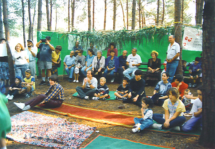 Зрители внимательно слушают концерт, сидя в символической сукке.