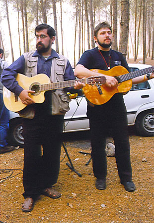 Группа из Иерусалима «Мелодия страны» дала концерт на нашем юбилее. На снимке - барды Марк Эпельзафт (слева) и Юрий Липманович. Зрители тепло встретили выступающих. |