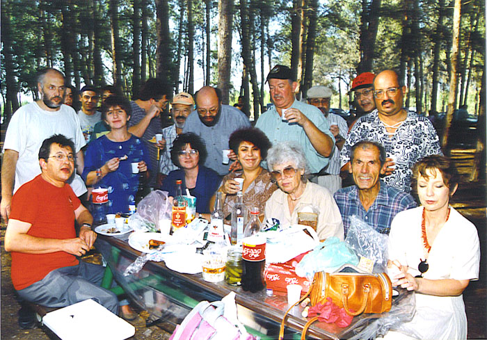 Лехаим – дело хорошее, особенно, когда стол полон яств. Слева направо: Эли Залк в красной майке, за ним Саша Якир в белой майке. Рядом Роза и Женя Финкельберг, Натан Шварцман, Леонид Прайсман, Саша Островский, Йосеф Асс (в белой кепке), Олег Белиловский, Игаль Гурвич в клетчатой рубахе. |