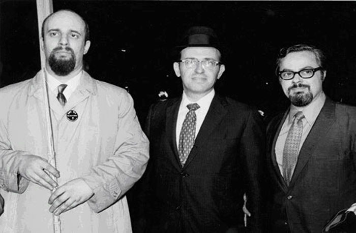 Основатель SSSJ Джейкоб Бирнбаум, раввины Норманн Ламм, Давид Геллер на празднике Симхат Тора в честь советских евреев, на площади Дага Хаммаршельда (бывшего Генерального секретаря ООН).