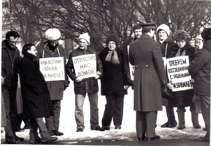 Демонстрация семи отказников у въезда на территорию зданий обкома и горкома КПСС (бывший Смольный Институт). 24 марта 1987, Ленинград.