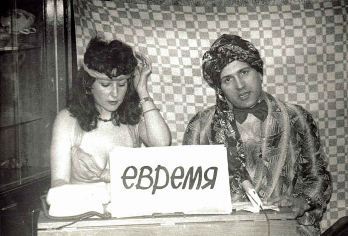 Слева направо: Аля Цвеир и Саша Шаинский исполняют роли телевизионных ведущих в пародии на советскую новостную телепередачу «Время» (в ходе спектакля заставка передачи менялась на «Бремя», «Евремя», «То еще времечко» и т.п.). Их костюмы пародируют одежду древней Персии во времена Ахашвероша.