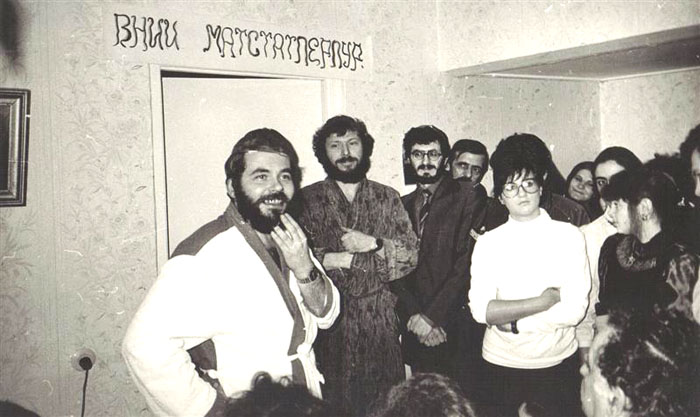 Актеры и зрители. В центре, третий слева – Александр Цвеер, за ним – Григорий Диккер. Над дверью – шутливое наименование научно-исследовательского института «Матстатперпур» - места действия Пуримского спектакля.